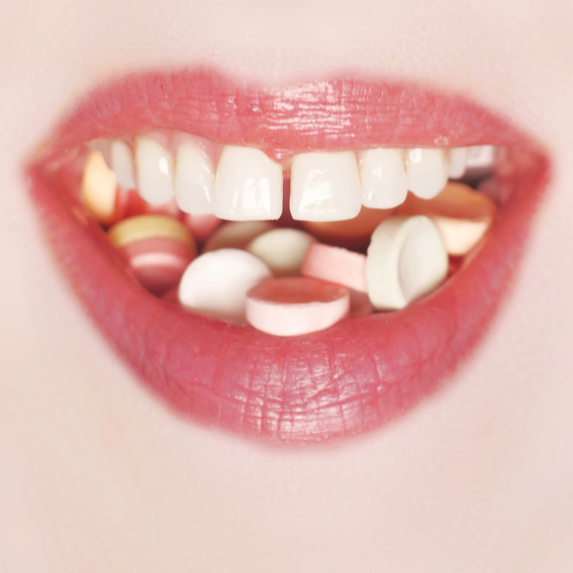 A clichéd, seductive mouth is juxtaposed with family-related, domestic stuffing.